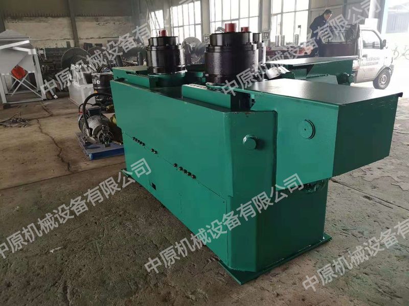 該機(jī)為叁輥型材卷圓機(jī),集機(jī)電一體。電機(jī)輸出的較高轉(zhuǎn)速通過(guò)傳動(dòng)裝置(聯(lián)軸器,液壓馬達(dá),液壓油缸,齒輪等)轉(zhuǎn)換成所需的大扭矩低轉(zhuǎn)速,帶動(dòng)兩主動(dòng)輥實(shí)現(xiàn)旋轉(zhuǎn)運(yùn)動(dòng),為型材行走提供扭矩。兩個(gè)主動(dòng)輥中心距可調(diào),被動(dòng)輥通過(guò)液壓油缸前進(jìn)、后退實(shí)現(xiàn)位移,來(lái)控制直徑大小。三個(gè)工作輥成等腰三角形分布,通過(guò)調(diào)整移動(dòng)輥實(shí)現(xiàn)這三個(gè)點(diǎn)形成的弧線達(dá)到所需彎曲半徑,借助被動(dòng)輥的壓緊及兩主動(dòng)輥的旋轉(zhuǎn)運(yùn)動(dòng),使型材經(jīng)過(guò)多次連續(xù)彎曲,產(chǎn)生永久性塑性變形,用于常溫狀態(tài)下將型材卷制成圓形,弧形等工件。